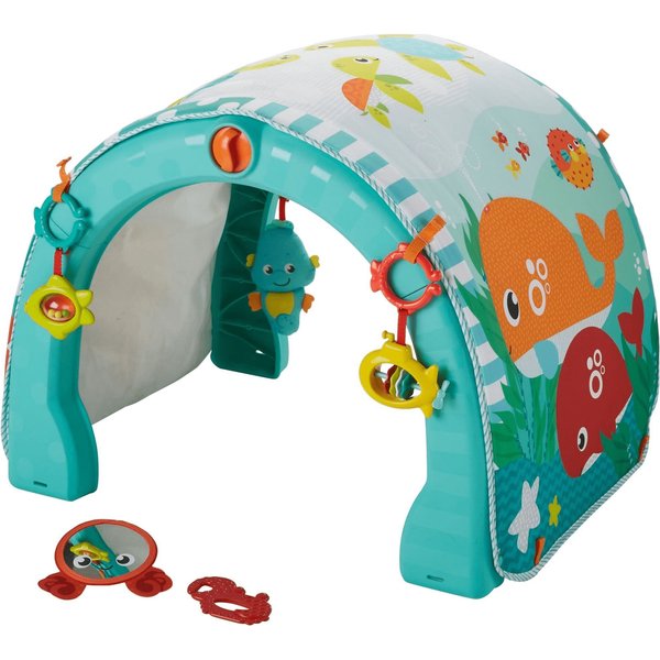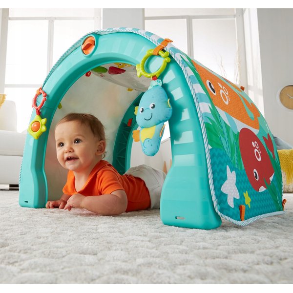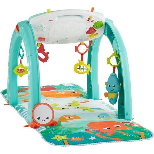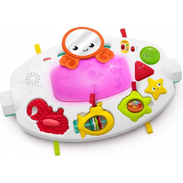 Mata zaciekawi malucha oferując mu zabawę dostosowaną do jego aktualnych sprawności lub chęci. Maluszek z zaciekawieniem patrzy na kolorowe, morskie zabawki na pałąku. Dziecko może bawić się na brzuszku a kolorowe obrazki ze zwierzątkami staną się jego najlepszymi przyjaciółmi. Na macie mnóstwo aktywności, klekoczących elementów do chwytania i potrząsania. Gdy przyjdzie ochota na raczkowanie, matę można w łatwy sposób przemienić w morski tunel, który pomoże maluszkowi w nauce poruszania się. Gdy maluch nieco podrośnie, produkt spełni rolę stolika do zabawy i przenośnej zabawki edukacyjnej. Urządzenie na panelu muzycznym odtwarza aż 45 różnych dźwięków, melodii, piosenek i wypowiedzi.