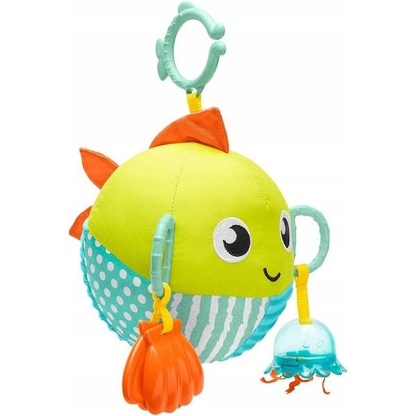 Rybka stanie się najlepszym przyjacielem Twojego maluszka! Pluszak posiada mnóstwo atrakcji, które zachęcą maluszka do zabawy: różnorodne materiały, kontrastowe kolory, klekocząca muszelka oraz grzechotka w postaci meduzy. Mnogość wzorów i różnorodnych faktur będzie rozwijać zmysł dotyku oraz wzroku dziecka. Dzięki zaczepowi zawieszkę z łatwością zamontujesz w łóżeczku, wózku, huśtawce czy foteliku.