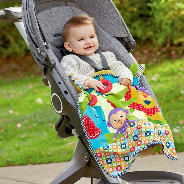 Mały odkrywca przy każdej zabawie będzie odkrywał nowe elementy, które go zaciekawią. Zabawka pomoże dziecku rozwijać zmysły, będzie ćwiczyć zdolności manualne oraz zręczność. Kocyk sprawdzi się zarówno w domu na podłodze jak i podczas spacerów wózkiem, a dzięki zaczepom nie spadnie podczas jazdy.