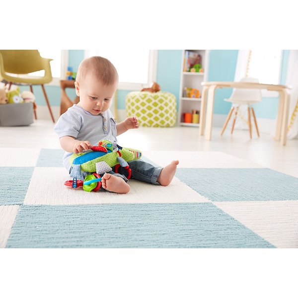 Zróżnicowane faktury zapewniają dziecku wrażenia dotykowe. Szeleszczące elementy oraz grzechotka z kolorowymi kuleczkami będą wpływać pozytywnie na rozwój słuchu dziecka. Są tu także kolorowe koraliki do trącania. Mnogość kolorów i wzorków będzie przykuwać uwagę dziecka i zachęcać do odkrywania zabawki.