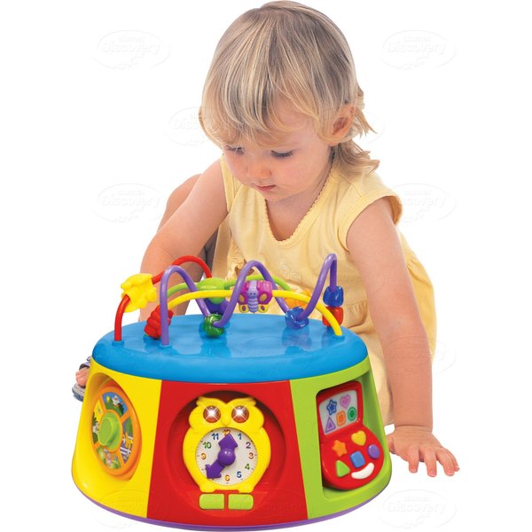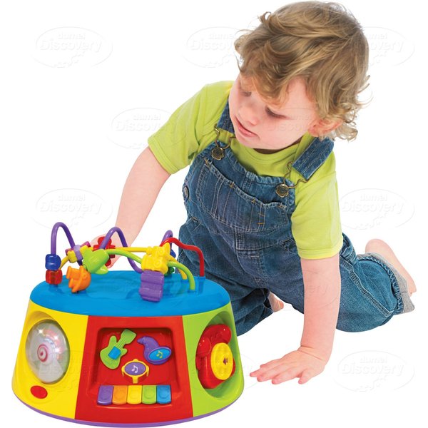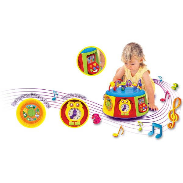 Maluch naciskając na różne strony pudełeczka uruchamia melodyjki, dźwięki, światełka. Dziecko może wykręcić numer na mini telefonie, naciskać guziczki o różnych kształtach, przekręcić wskazówki zegara w kształcie sowy lub zagrać na mini pianinku.