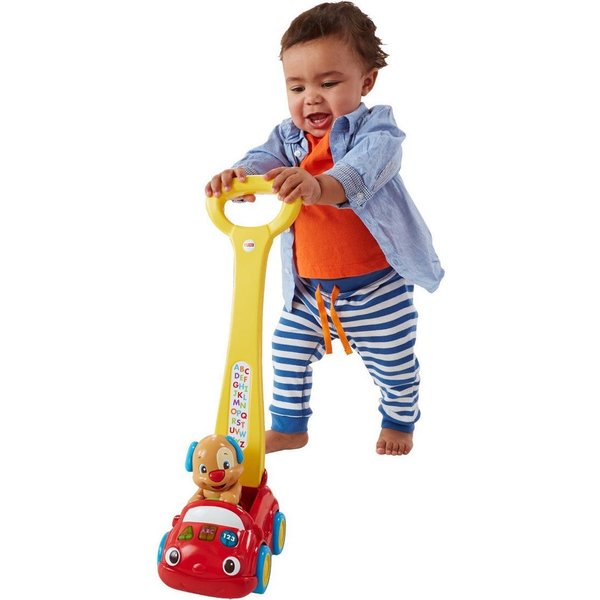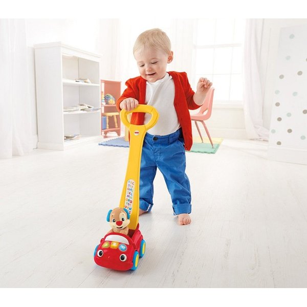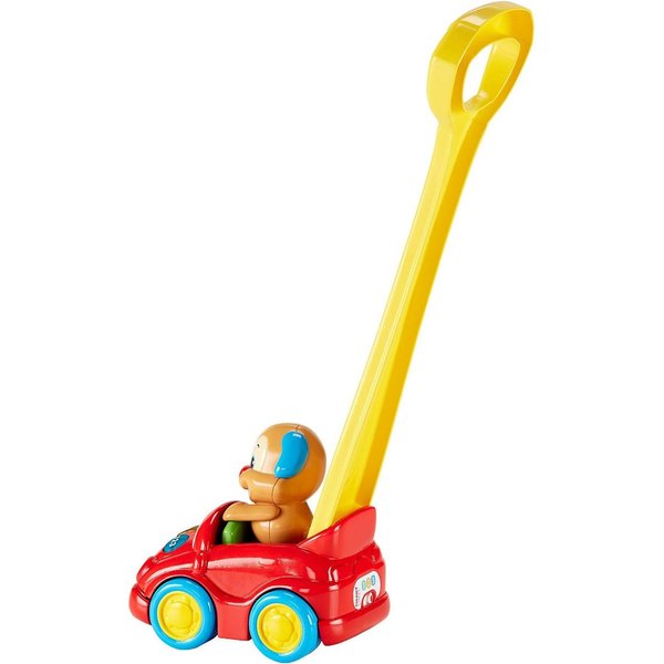 Wesoły pchacz-szczeniaczek to nauka raczkowania i chodzenia oraz świetna zabawa w jednym. Maluch może pchać zabawkę przed siebie ucząc się przy tym pierwszych kroków lub doskonaląc naukę chodzenia. Gdy maluszkowi znudzi się chodzenie z kijkiem szczeniaczkowe autko można odczepić i zacząć zabawę w pozycji siedzącej. Kółka samochodziku kręcą się, maluch może gonić uciekający pojazd na czworaka!