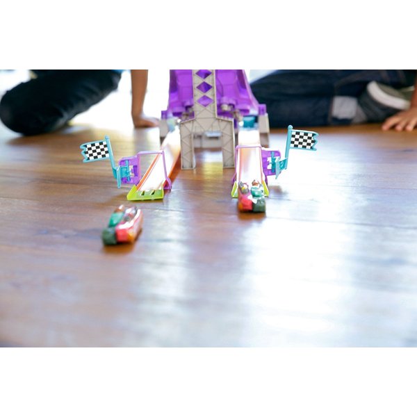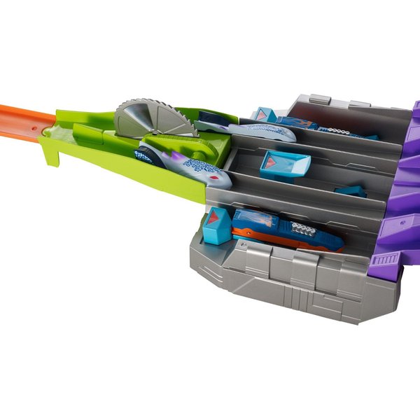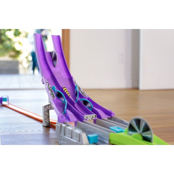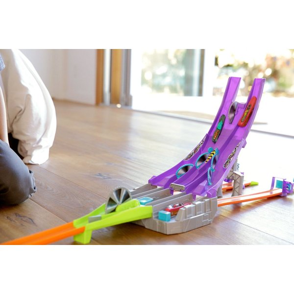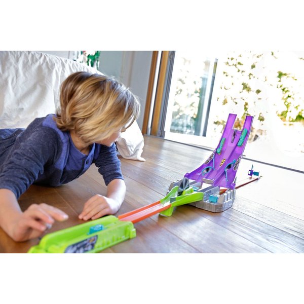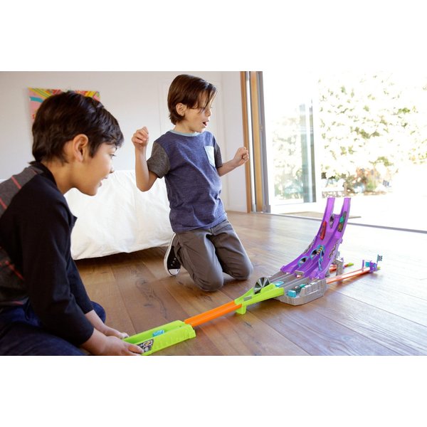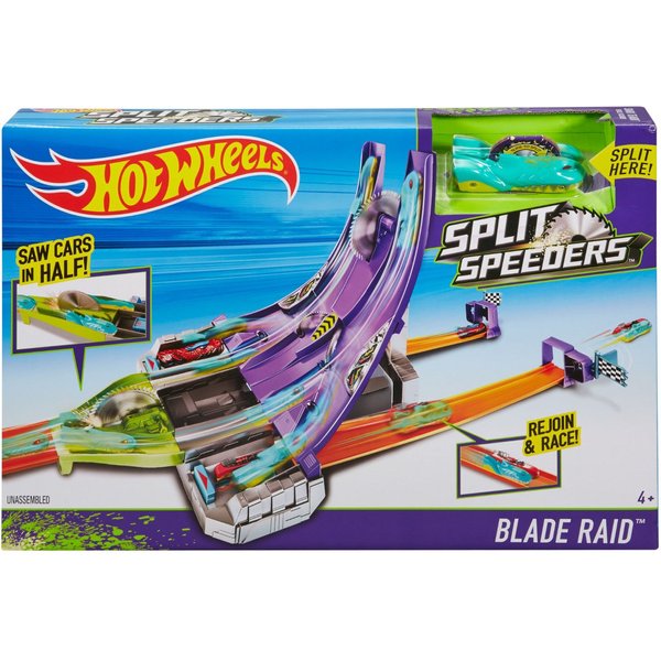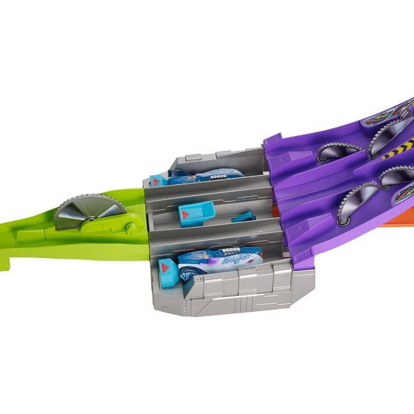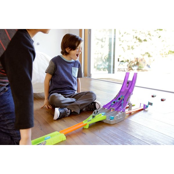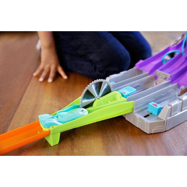 Wyczynowy zjazd to trasa dedykowana specjalnie dla samochodzików z nowej serii Hot Wheels. Wystartuj automagnesiakiem i patrz, jak autko zostaje "rozcięte" przez piłę na pół, by później znów się połączyć! Łącz połówki różnych modeli za pomocą wbudowanych magnesów i twórz nowe, unikatowe pojazdy.