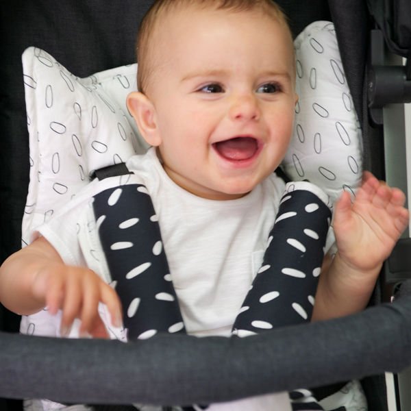 W zestawie znajduje się wkładka do wózka oraz nakładki na pasy.