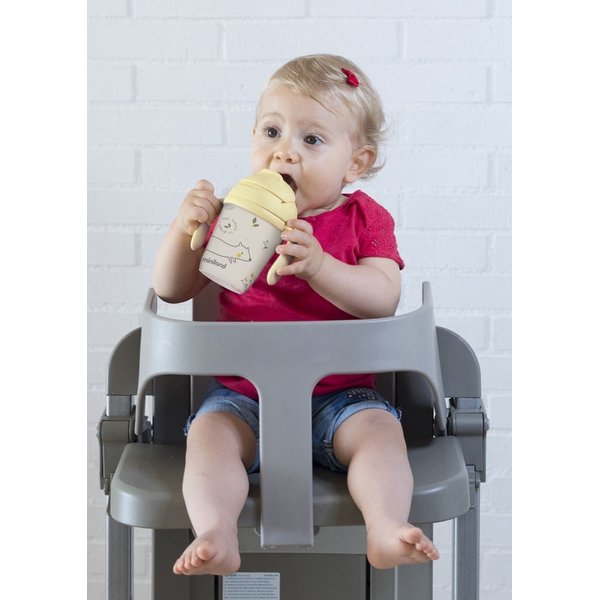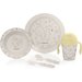 W zestawie znajdują się naczynia potrzebne do pierwszych samodzielnych posiłków twojego maluszka: talerzyk, miseczka, kubek oraz sztućce.