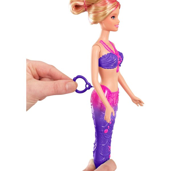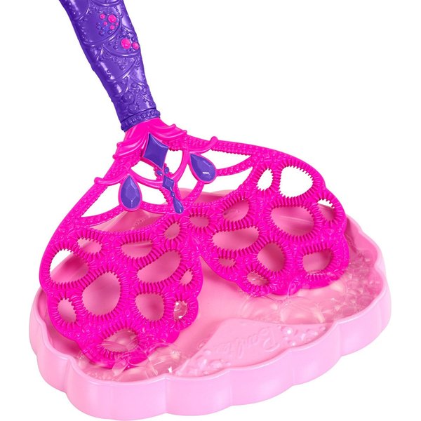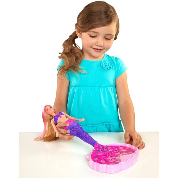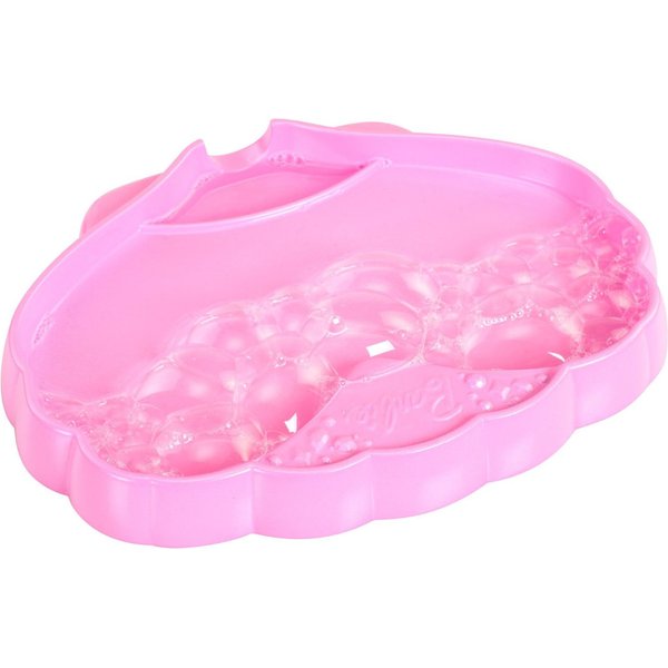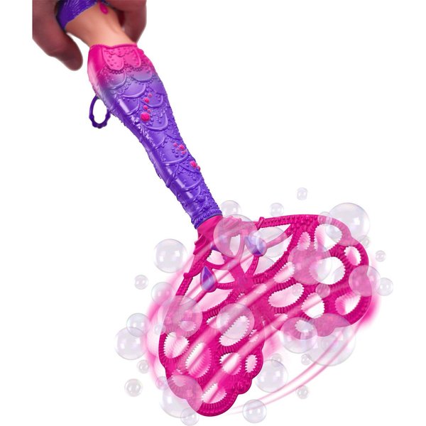 Syrenka może za pomocą swojego kolorowego ogona zrobić mnóstwo baniek, które zapewnią dzieciom fantastyczną zabawę. W zestawie znajduje się tacka w kształcie muszelki przeznaczona na płyn do puszczania baniek. Dekoracyjne wycięcia na ogonie służą nie tylko do ozdoby. Wystarczy, że kilka razy pociągnie się za sznureczek na plecach lalki, a ogon zacznie wirować i wypuszczać mnóstwo ślicznych bąbelków. A kiedy nadejdzie czas powrotu na suchy ląd, dziewczynki mogą bawić się dalej, układając lalce fryzury, dzięki dołączonej szczotce. Diadem przyozdobi głowę syrenki.