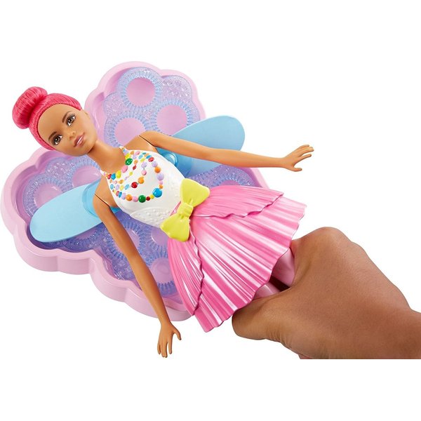 Wróżka prezentuje się niesamowicie! Ma ciemną karnację oraz włosy w kolorze intensywnego różu upięte w kok - z pewnością zachwyci fankę zaczarowanych przygód Barbie.