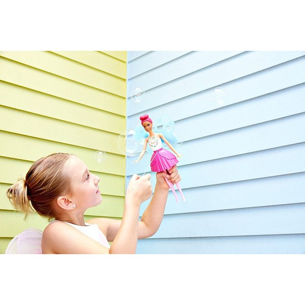Wlej do zbiorniczka płyn dołączony do zestawu i zanurz w nim skrzydła lalki. Teraz pociągnij za kokardkę na jej brzuchu i patrz jak z brokatowych skrzydełek wydostają się przepiękne bańki - każdy je uwielbiają!