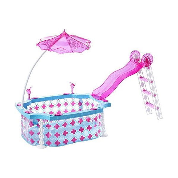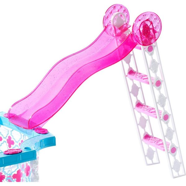 Każda mała dziewczyna marzy o prawdziwym basenie ze zjeżdżalnią dla Barbie i jej koleżanek. Do basenu można nalać wody!