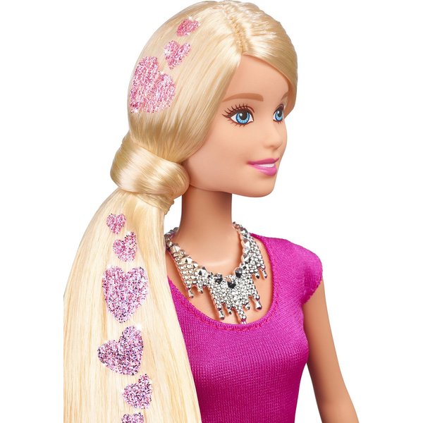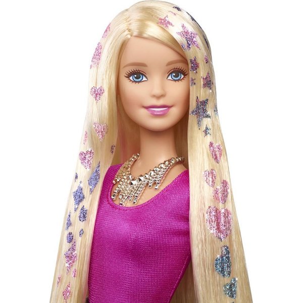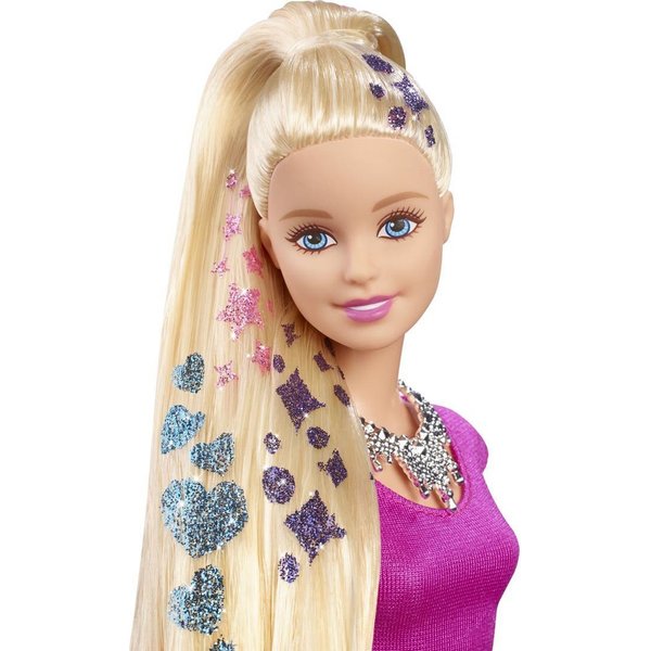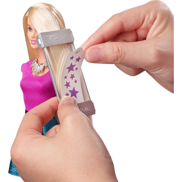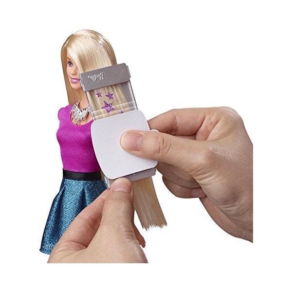 Wybierz wzór oraz kolor brokatu i stwórz wspaniałą fryzurę! Wystarczy włożyć pasemko długich blond włosów lalki Barbie do przyrządu, przyłożyć wybrany wzór, nanieść brokat i gotowe. Teraz Barbie będzie naprawdę błyszczeć na przyjęciach!
