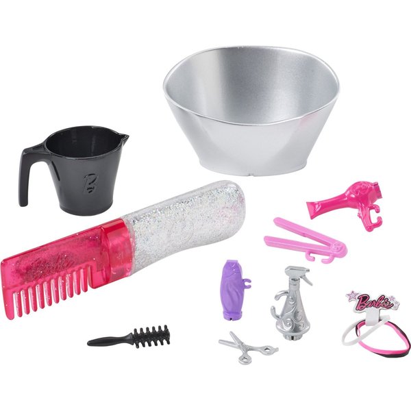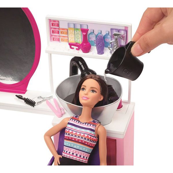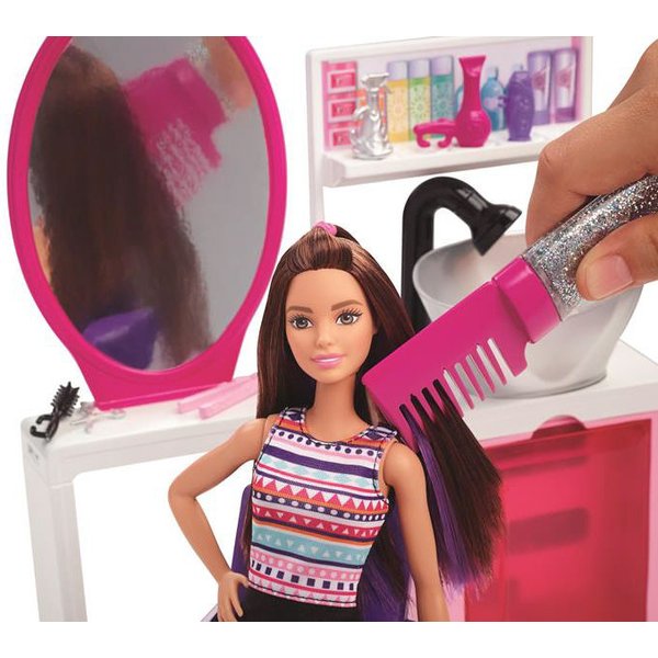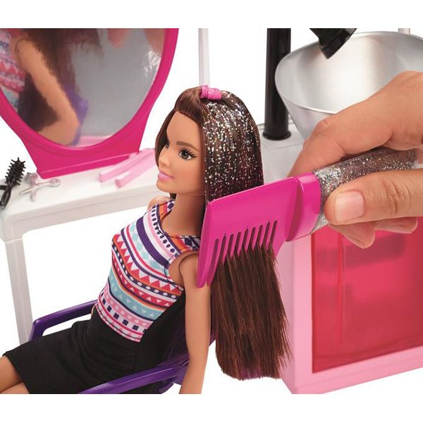 Zabierz Barbie do swojego nowego salonu fryzjerskiego i stwórz wspaniałą fryzurę! Wystarczy, że użyjesz do stylizacji specjalnego grzebienia dołączonego do zestawu, a włosy lalki pokryją się błyszczącym brokatem! Barbie z pewnością zachwyci wszystkich na przyjęciach!