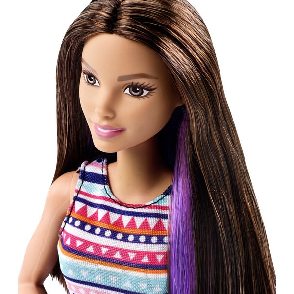 Wśród akcesoriów znajduje się prostownica, nożyczki, suszarka, spray oraz gumki do włosów. Lalka ubrana jest w modną sukienkę.