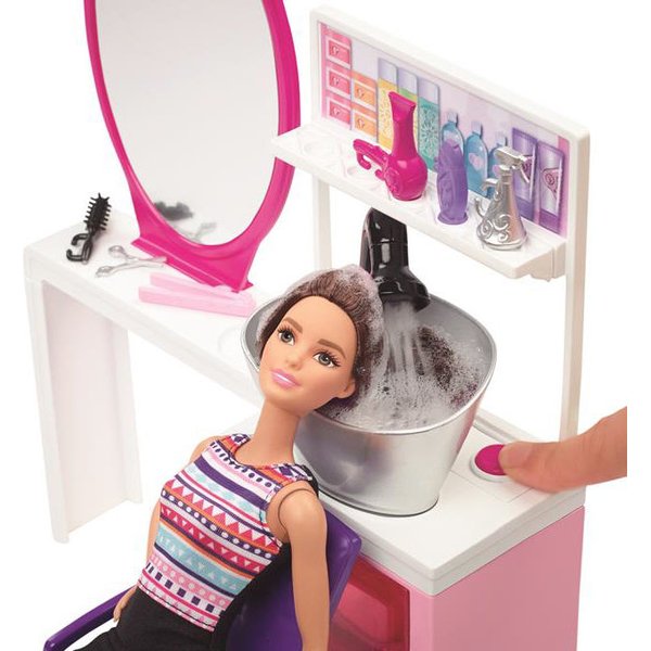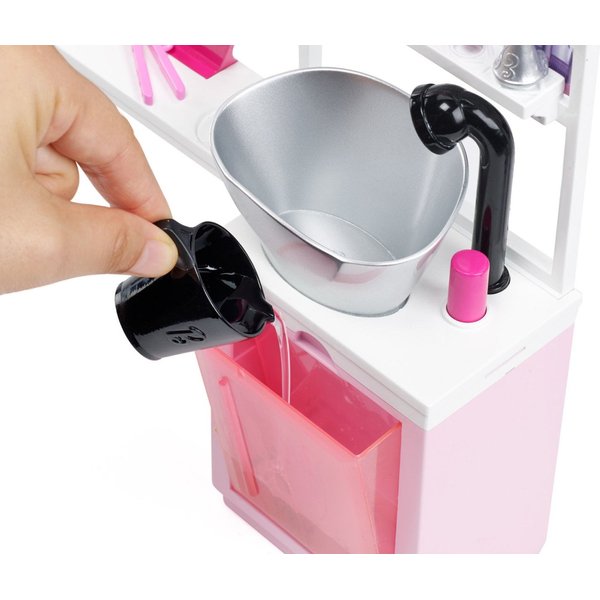 Zmycie brokatu z włosów Barbie jest niesamowicie proste, a do tego będzie świetną zabawą! Napełnij pojemnik w szafce mydłem oraz wodą, a kranik zadziała jak prawdziwy! Usadź Barbie na wygodnym fotelu i umyj dokładnie jej włosy.