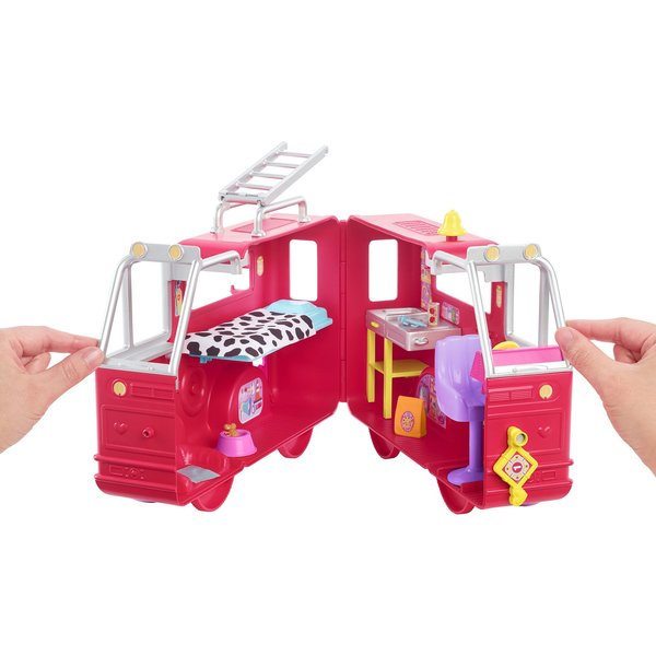 Niech Twoja pociecha wcieli się w rolę sympatycznej i odważnej strażaczki, ratującej swoich małych zwierzęcych przyjaciół - kotka i pieska. Piękny, różowy wóz strażacki kryje w sobie zestaw niezbędnych akcesoriów, potrzebnych w codziennej pracy strażaków: drabinę i węża strażackiego. Dzielna laleczka ma też do dyspozycji takie przedmioty, jak umywalka, fotel, stanowisko pierwszej pomocy i łóżko piętrowe dla poszkodowanych. Taki zestaw to znakomity sposób na snucie mnóstwa różnych opowieści. Niech Twoja pociecha dołączy do niego jeszcze inne lalki Barbie i Chelsea (do kupienia osobno), aby zabawa była jeszcze lepsza. Uwaga: kolorystyka niektórych elementów zabawki może się nieco różnić od tej prezentowanej na zdjęciach.