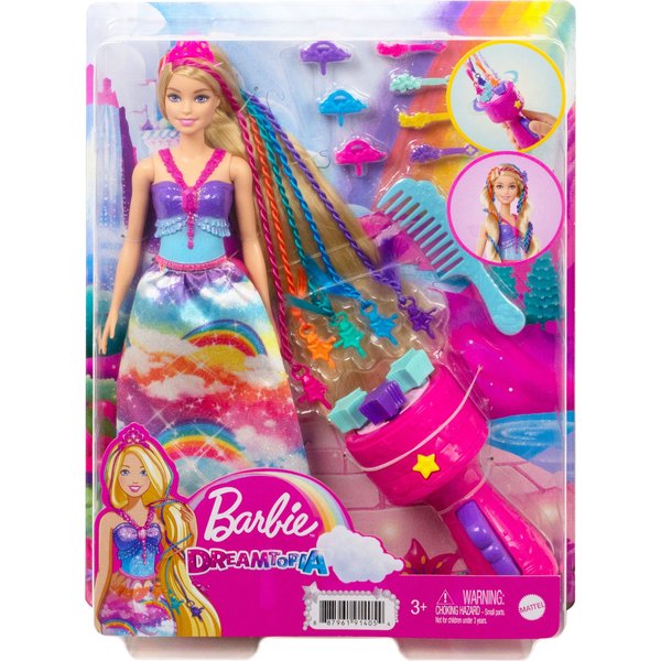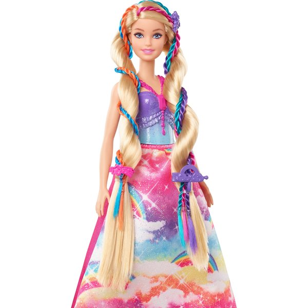 - lalkę Barbie™ Dreamtopia z długimi włosami (ok. 21 cm), kolorowymi pasemkami i w tęczowym stroju księżniczki (błyszczący gorset i zdejmowana spódniczka)