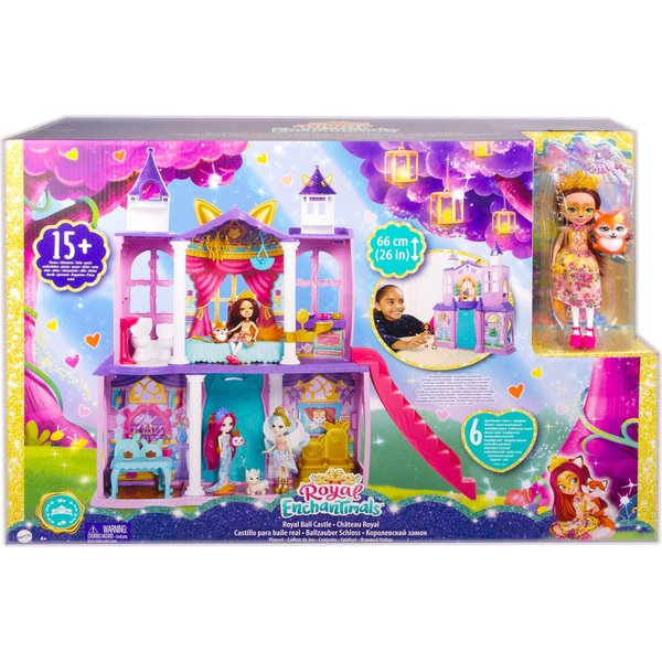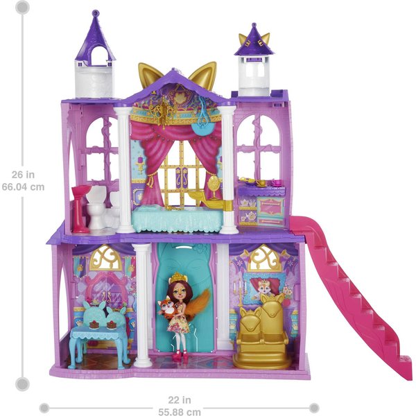 Duży zestaw to ogromne możliwości swobodnego opowiadania własnych historii wymyślonych przez dziecko. Wysoki na 66 cm pałac to 5 różnych obszarów zabawy dla lalki Felicity Fox i jej zwierzątka - liska Flick. Królewskie stroje tej pary idealnie pasują do otoczenia: piękne komnaty z meblami, huśtawką, i łóżeczkiem, bo nawet księżniczka musi kiedyś spać! Twoja pociecha może bawić się w gotowanie, wydawanie podwieczorku, kolacji a nawet balu - jeśli tylko dołączy do zestawu inne lalki z serii Enchantimals (do kupienia osobno, najlepiej pasują te o wielkości 15 - 20 cm). Dwa trony i królewskie akcesoria z pewnością znajdą zastosowanie w niejednej opowieści!