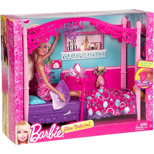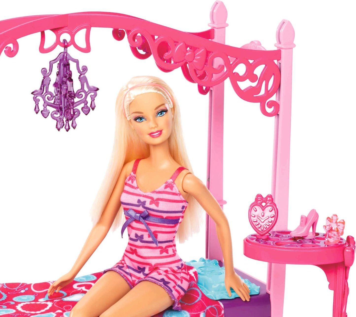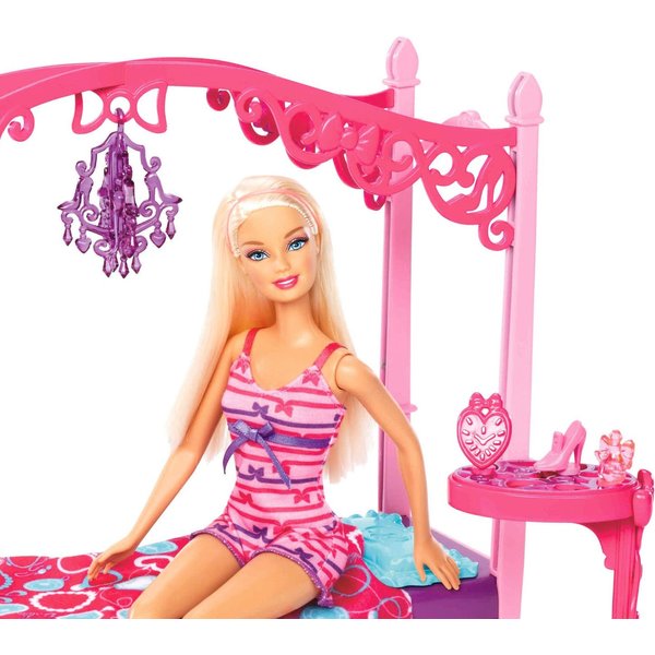 Różowy zestaw do sypialni zawiera wszystko co jest potrzebne, aby Barbie mogła się zrelaksować i wyspać po przyjęciu. Może również zaprosić koleżanki i zorganizować piżama party w swojej sypialni.