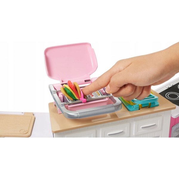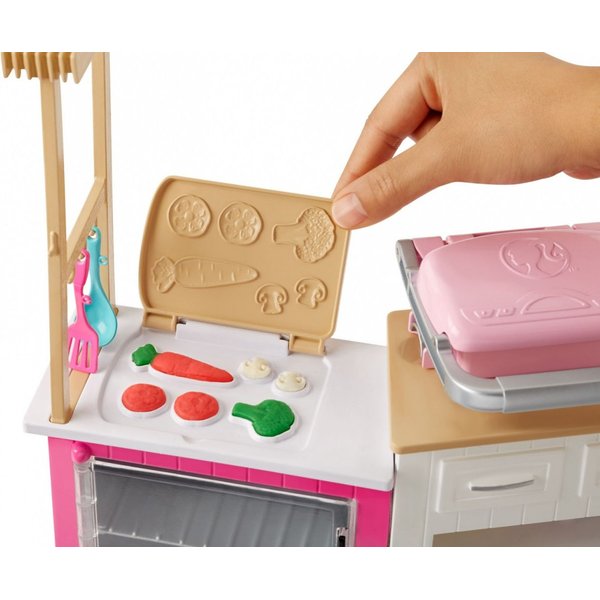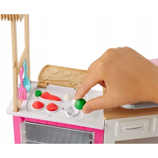Pomóż Barbie zrobić wspaniałe przyjęcie dla przyjaciół dzięki akcesoriom do gotowania i masie plastycznej, dzięki której stworzysz warzywa, potrawy i słodkości potrzebne do przyjęcia gości. Kuchenka jest bardzo realistyczna - posiada światełka imitujące rozgrzany palnik, dźwięk otwieranego piekarnika. Frytkownica tworzy frytki, foremki warzywka. Część akcesoriów przystosowana jest do tego, by lalka mogła trzymać je w ręce, co znacząco uatrakcyjni zabawę!