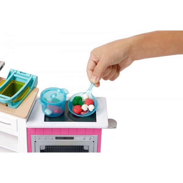 Każda mała dziewczyna marzy o urządzaniu domku dla Barbie, a Idealna Kuchnia posiada wszystko co jest potrzebne, aby Barbie mogła ugotować pyszne jedzenie dla swoich gości.