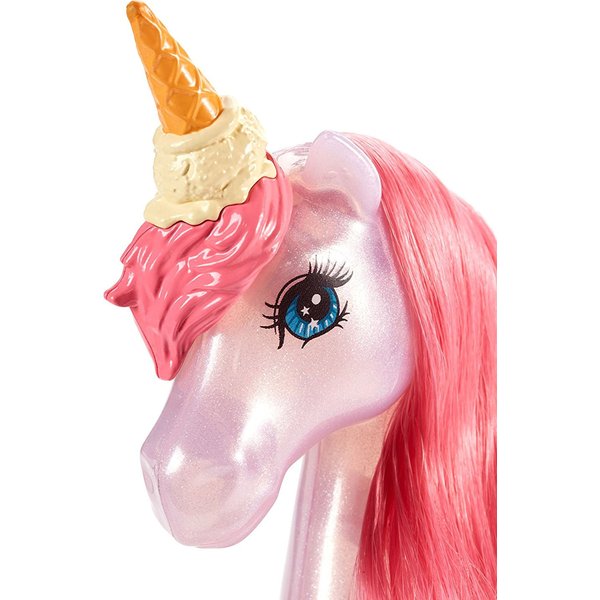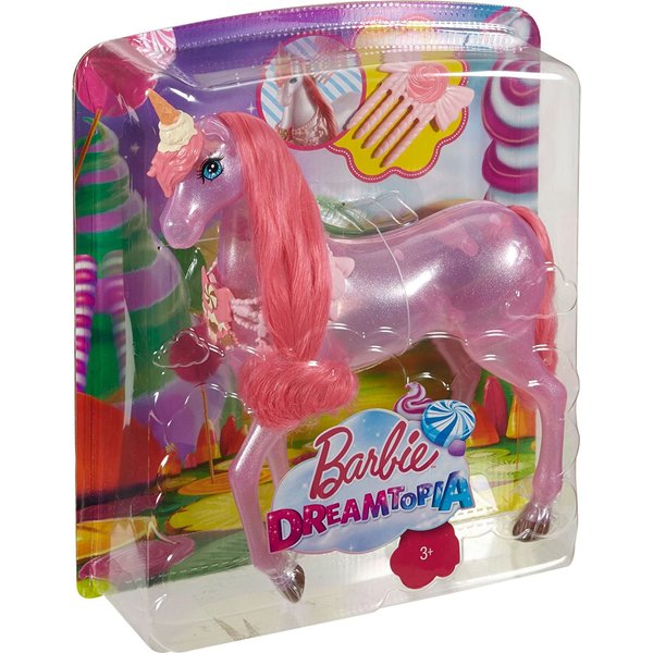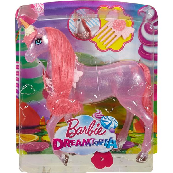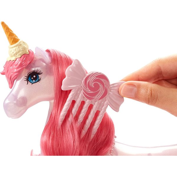 Teraz wraz z bajkową karocą można odgrywać sceny z bajki Barbie Dreamtopia Kraina Słodkości. Usadź Barbie na wyjątkowym jednorożcu - prezentuje się przepięknie! Do zestawu dodano cukierkowy grzebyk do czesania grzywy.