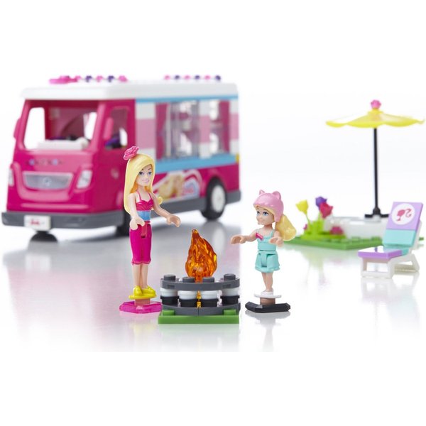 Zbuduj ogromny kamper dla Barbie i wyrusz na wakacyjną przygodę. Barbie postanowiła pojechać na wakacje razem ze swoją siostrą Chelsea. Dziewczyny będą się świetnie bawić podczas codziennych kąpieli w basenie i leżakowaniu na słońcu. Ciepły wieczór mogą spędzić przy ognisko, popijając pyszne koktajle. W kamperze znajduje się piętrowe łóżko oraz toaletka.