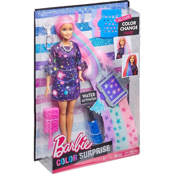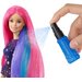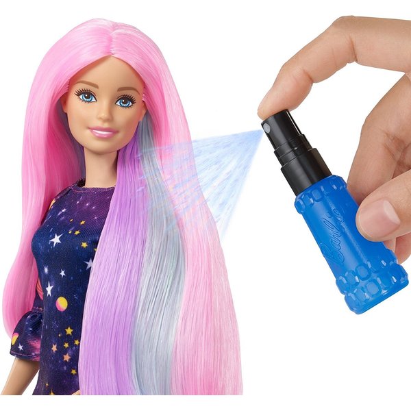 Stwórz niepowtarzalną fryzurę Barbie! Wystarczy wybrać jeden ze wzorów i przyłożyć go do włosów, następnie spryskać specjalnym płynem z flakoniku! Patrz jak włosy Barbie zmieniają swój wygląd!