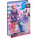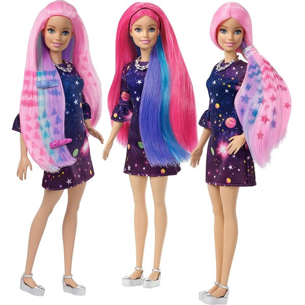 Wśród akcesoriów znajdują się spinki w różnych kolorach oraz gumki do włosów i szczotka do czesania. Lalka ubrana jest w kosmiczną sukienkę.