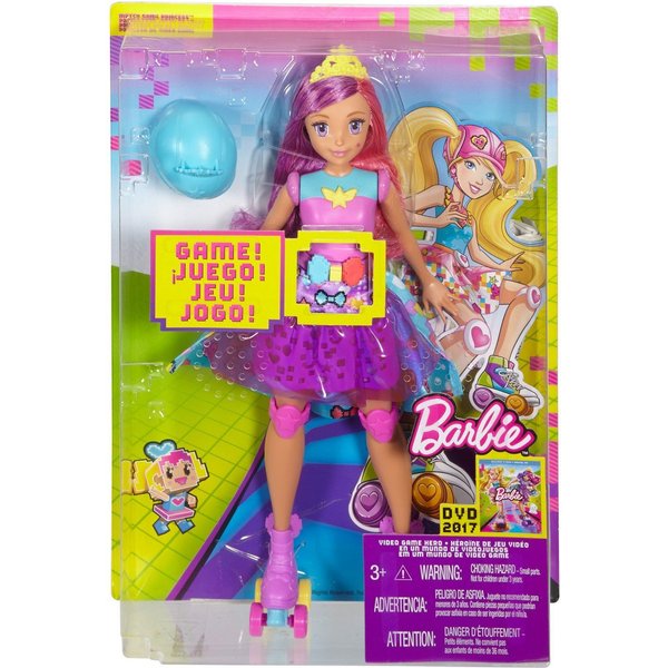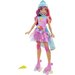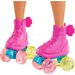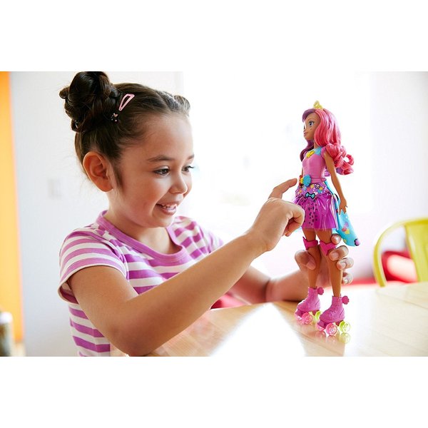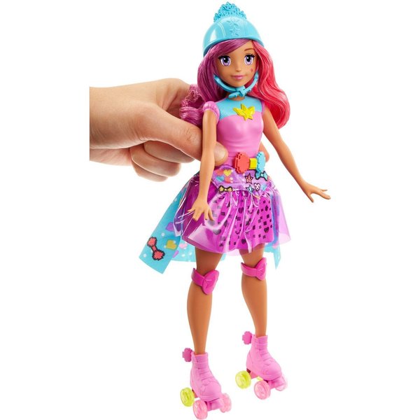 Lalka z nowego filmu "Barbie w świecie gier" ma na sobie stylową spódniczkę oraz kolorowe wrotki. Długie różowo fioletowe włosy ozdobione są tiarą - wygląda dokładnie jak w bajce!