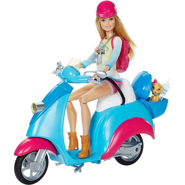 Niebiesko-różowy skuter dla Barbie to prawdziwa zabawa. Koła w pojeździe się kręcą! Do siodełek przyczepiony jest pasek, które sprawi że lalka siedzi na skuterze i nie będzie spadać w trakcie jazdy. Z tyłu zamontowany jest koszyczek, w którym Barbie może przewozić swojego szczeniaczka.