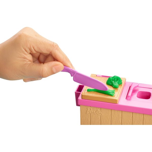 Teraz Twoja Barbie może zostać Master Chefem! Z zestawem do domowego makaronu stworzycie wiele wspaniałych i pysznych dań! Wystarczy wyciągnąć ciasto i włożyć je do otworu w stacji roboczej. Dodatkowo do klusek możecie stworzyć warzywa, które dodadzą smaku waszym potrawom. Ćwiczcie swoje zdolności i zapraszajcie gości do degustowania! Z taką asystentką gotowanie pójdzie gładko.
