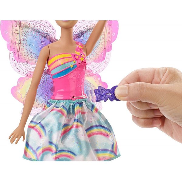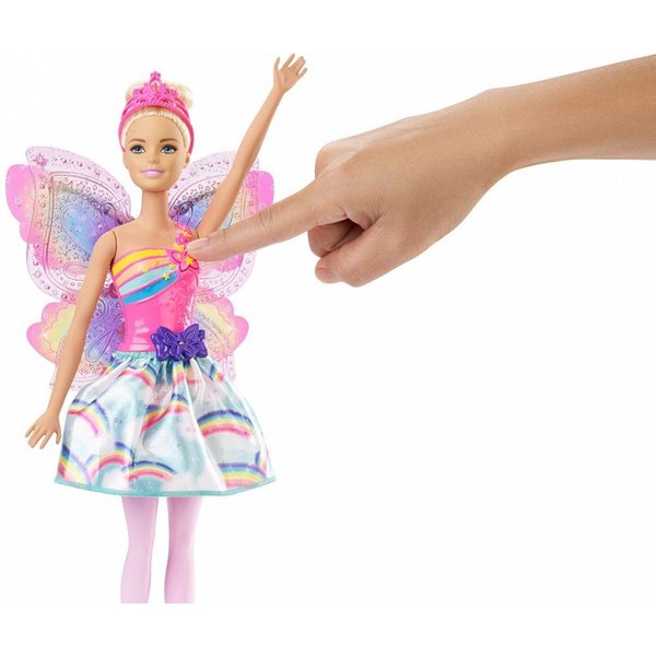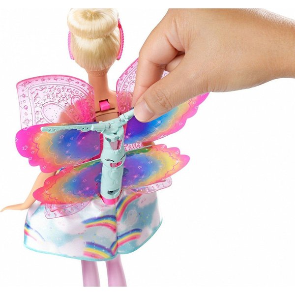 Już teraz przenieś się do krainy Dreamtopia wraz z nową, latającą Barbie. Lalka ta zainspiruje każdą dziewczynkę do magicznej, kreatywnej zabawy. Wybierz jeden z zestawów skrzydeł i przymocuj go na plecach Barbie. Następnie cztery razy pociągnij kokardkę znajdującą się w talii lalki. Aby zobaczyć jak Barbie wznosi się w powietrze - naciśnij przycisk motyla na jej bluzce. Piękne i kolorowe wzory na skrzydłach oraz ich falisty ruch sprawią, że Barbie będzie wyglądać jak przepiękny motyl.