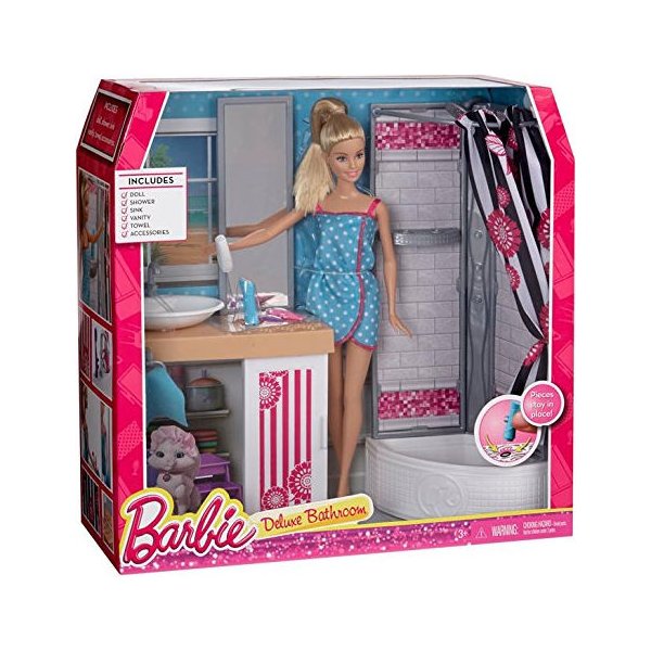 Zestaw deluxe do łazienki zawiera wszystko co jest potrzebne, aby Barbie mogła się zrelaksować i odbyć długą kąpiel po przyjęciu.