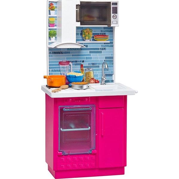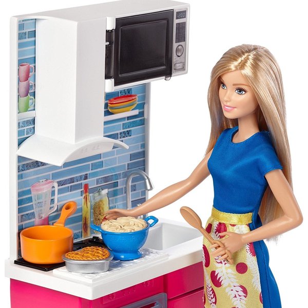 Zestaw kuchnia zawiera wszystko co jest potrzebne, aby Barbie mogła ugotować pyszne jedzenie dla swoich gości.
