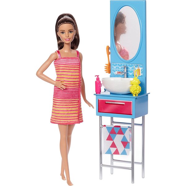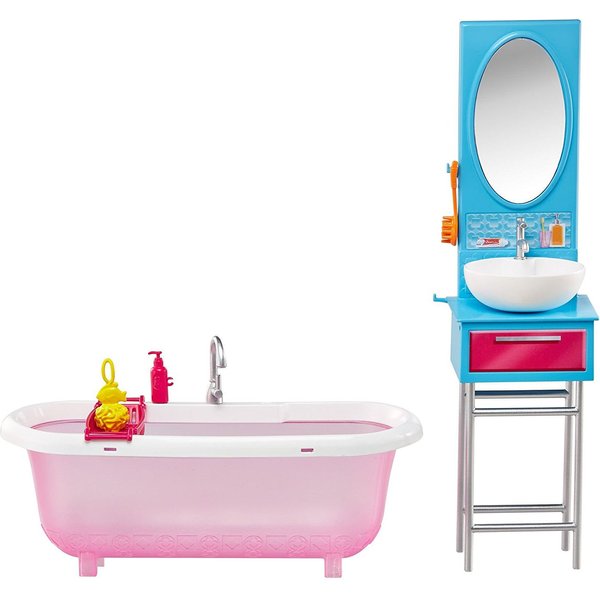 Zestaw do łazienki zawiera wszystko co jest potrzebne, aby Barbie mogła się zrelaksować i odbyć długą kąpiel po przyjęciu.