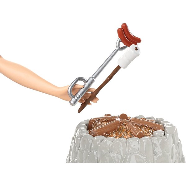 Barbie uwielbia spędzać czas poza miastem, na łonie natury. Teraz możesz rozpalić z nią ognisko i upiec kiełbaski! Posadź lalkę na stołeczku, weź do ręki widełki z kiełbaskami i piec je nad ogniem z paleniska - ale frajda! Aby zabawa była jeszcze ciekawsza ognisko zostało wyposażone w efekty świetlne i dźwiękowe.