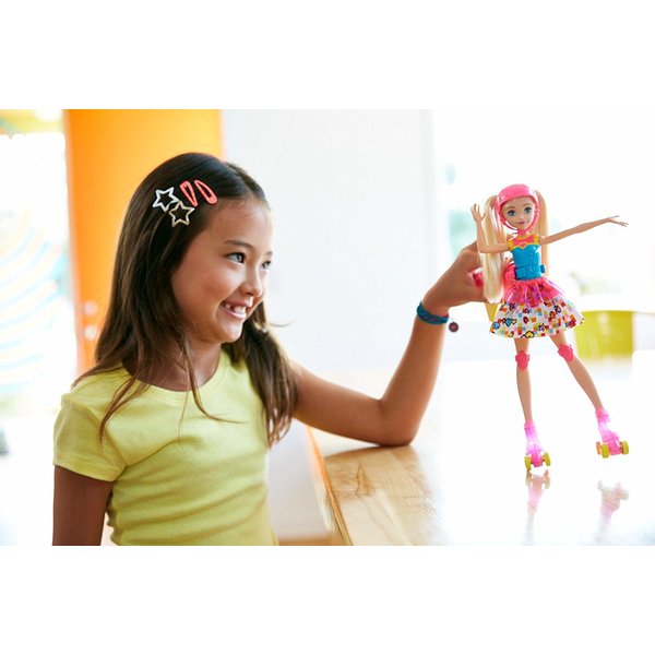 Czas na szaloną przejażdżkę! Załóż na głowę Barbie kask, a do talii przymocuj specjalny uchwyt - teraz możesz nią sterować i wykonywać piruety. Kiedy koła zostaną wprawione w ruch wrotki zaczynają świecić - ale frajda!