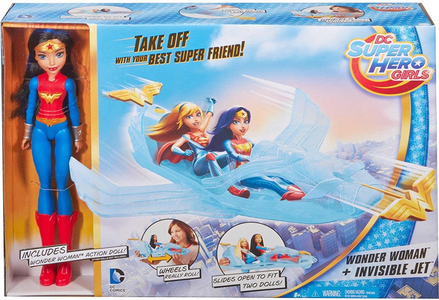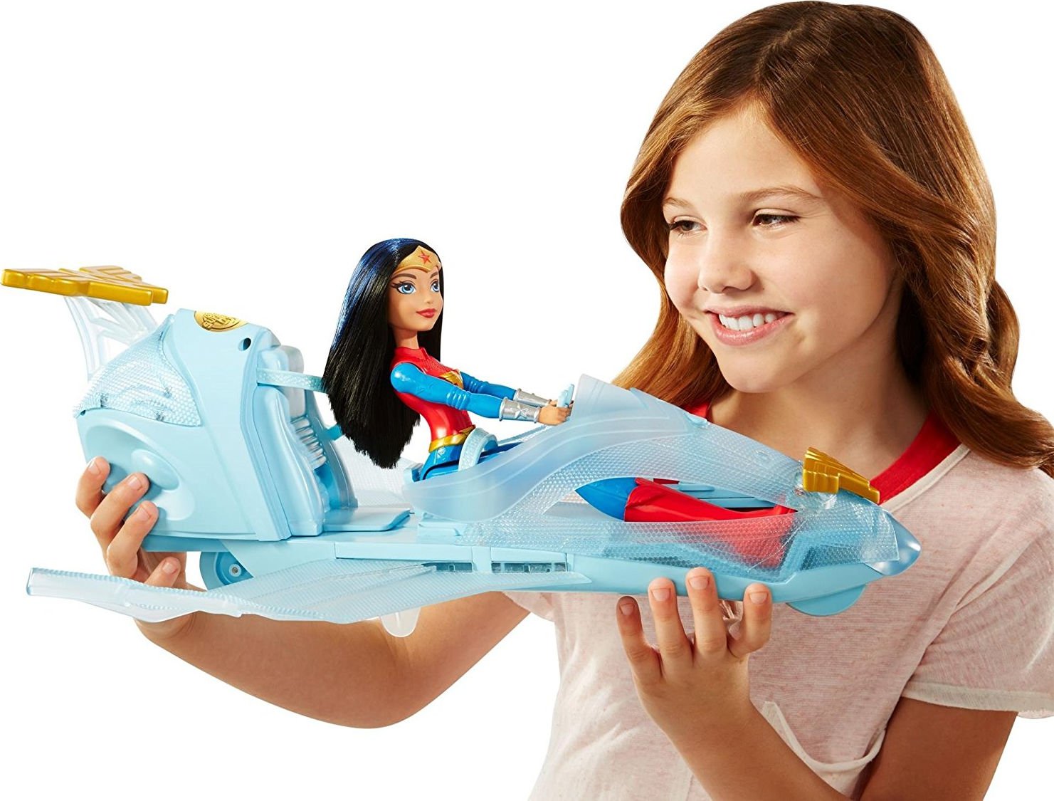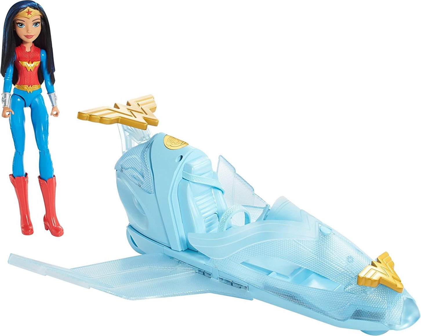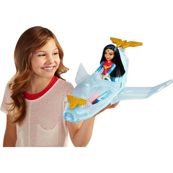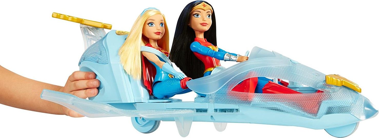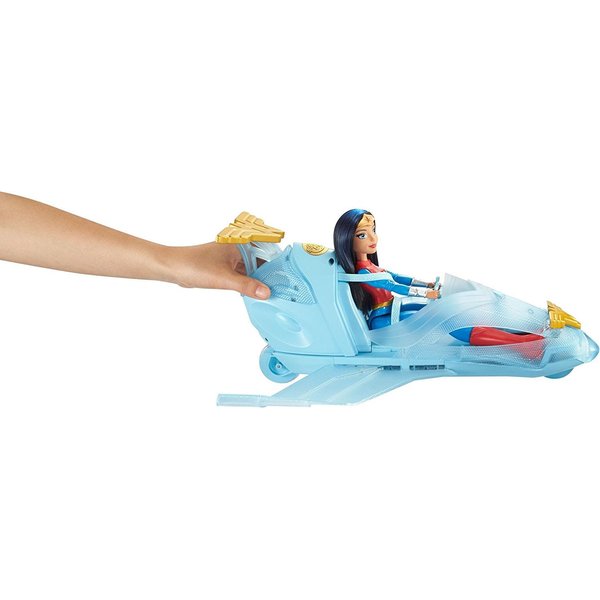 Bohatera wyrusza w podniebną podróż w swoim super szybkim odrzutowcu! Samolot zdobią go emblematy Wonder Women a jego barwa przypomina niebo. Gdy przyjdzie potrzeba możesz użyć pocisku umieszczonego z przodu samoloty - wystarczy wcisnąć przycisk. Pojazd rozszerza się, dzięki czemu możemy zabrać ze sobą inna superbohaterkę w podróż