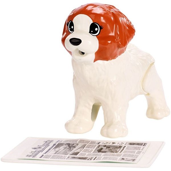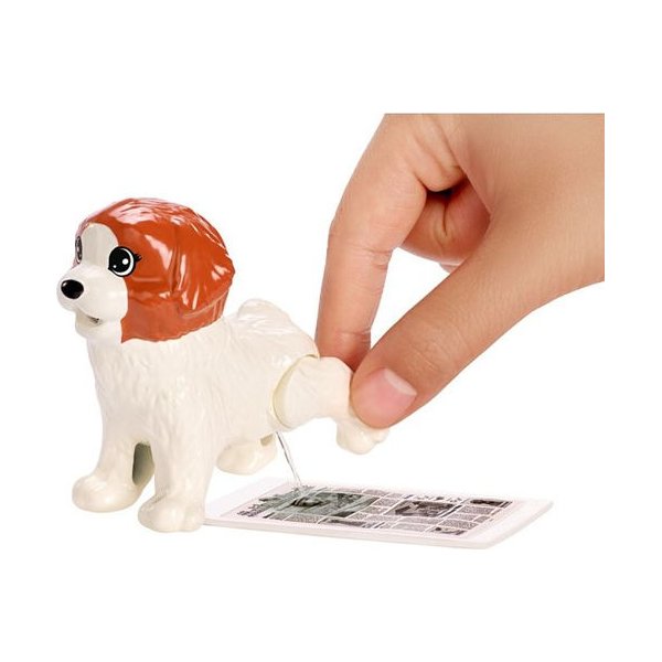 Duży jasnobrązowy piesek po zjedzeniu swoich kosteczek robi kupkę! Wystarczy nacisnąć jego ogonek. Biały piesek po wypiciu wody z butelki robi siusiu! Wystarczy postawić go na gazecie i podnieść jego tylną łapkę - woda zmieni kolor gazety. Barbie uwielbia wychodzić na spacer ze swoją gromadką pupili.