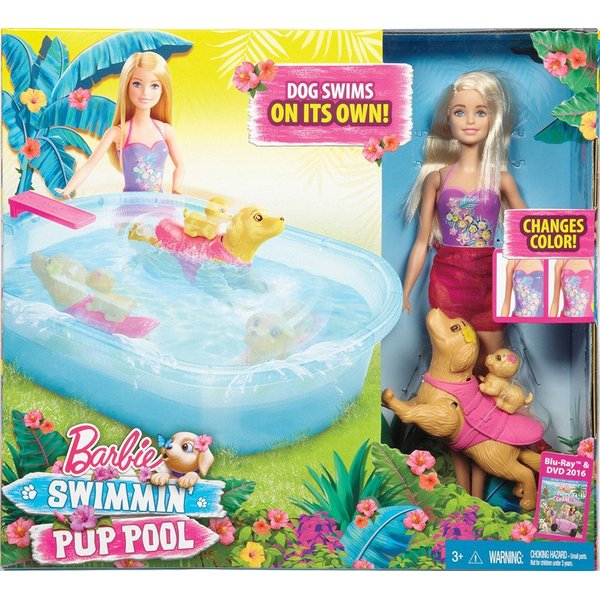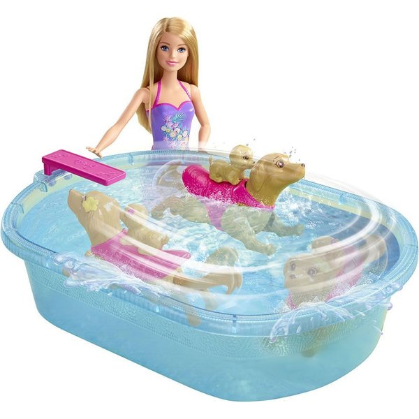 Czas na wspólną kąpiel w basenie. Wystarczy nakręcić ogonek pieska i wcisnąć przycisk na jego kostiumie, by zaczął płynąć w koło basenu. Umieść na jego grzbiecie małego szczeniaczka - wspólna kąpiel z mamą będzie wielką frajdą! Jest tu też skocznia, dzięki której pieski mogą skakać do wody.