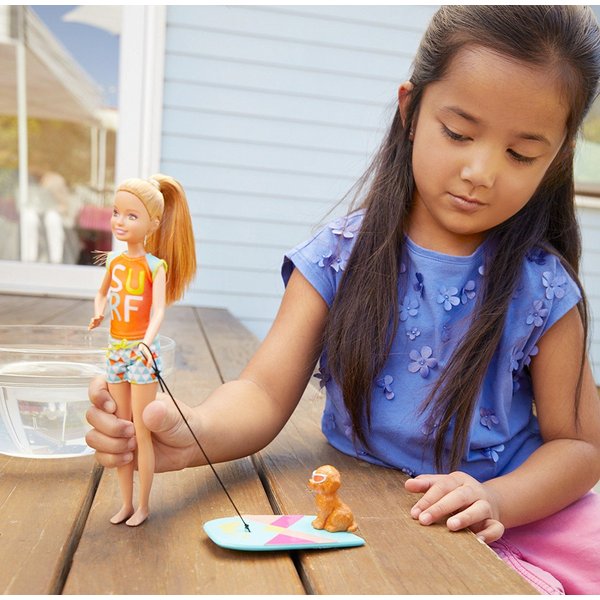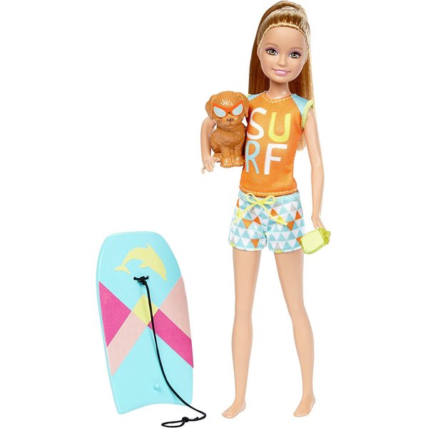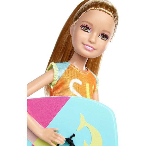Siostra Barbie, Stacie, prosto z filmu Barbie Delfiny z Magicznej Wyspy. Ubrana w krótkie szorty oraz top idealny na lato. Ma ze sobą deskę do bodyboardingu z uroczym wzorem delfinka - ale frajda! Podczas zabawy w wodzie Stacie będzie towarzyszyć mały piesek.