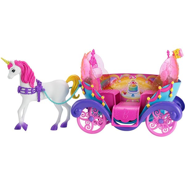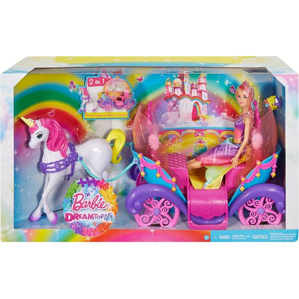 Teraz wraz z bajkową karocą można odgrywać sceny z najnowszego filmu Barbie Dreamtopia. Pojazd Barbie zaprzęgnięty jest w białego konika - prezentuje się przepięknie! Konika można odczepić i bawić się nim oddzielnie. Dodatkowo kiedy złączysz ze sobą przeźroczyste ścianki karocy powstanie kryształowa kopuła - pojazd dla prawdziwej księżniczki!