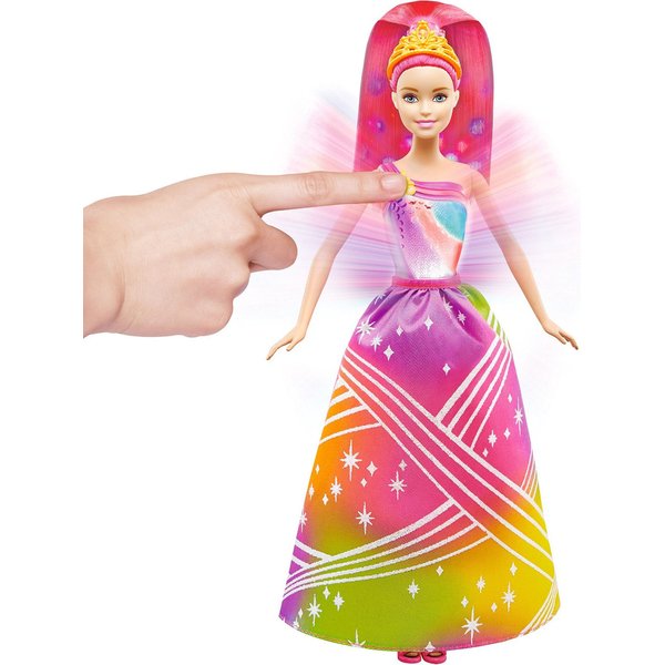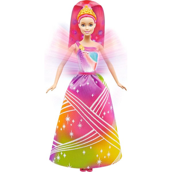 Urocza Barbie z Tęczowej Krainy Dreamtopia ma długie różowe włosy przyozdobione tiarą. Jak na księżniczkę przystało ubrana jest w piękną, balową suknię pełną kolorów i brokatowych zdobień, Księżniczka kryje prawdziwą niespodziankę, po naciśnięciu brylancika na sukience lalki jej gorset zacznie pięknie świecić w rytm wydobywającego się dźwięku!