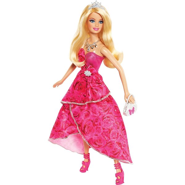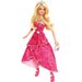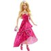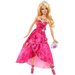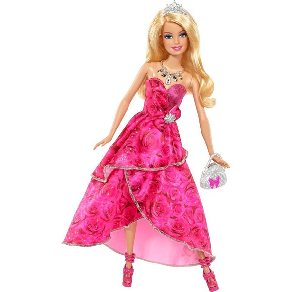 Barbie ubrana w olśniewającą suknię, idealną na urodzinowe przyjęcie. Piękną i świecącą kreacje uzupełnia perłowa torebka, różowe sandałki na szpilce oraz błyszczący naszyjnik.