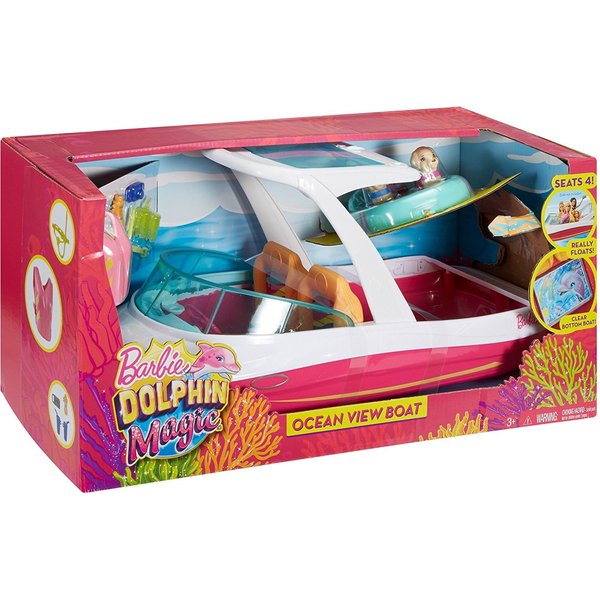 Jacht posiada różowe wnętrze wraz z 4 fotelami dla Barbie oraz jej 3 przyjaciółek, przed wodą rozbijającą się o dziób jachtu ochroni piękna, błękitna, zaokrąglona szybka. Podczas wodnego rejsu, możesz oglądać delfiny na żywo! a to wszystko dzięki specjalnej szybce w pokładzie jachtu - szykuje się wspaniała wyprawa!