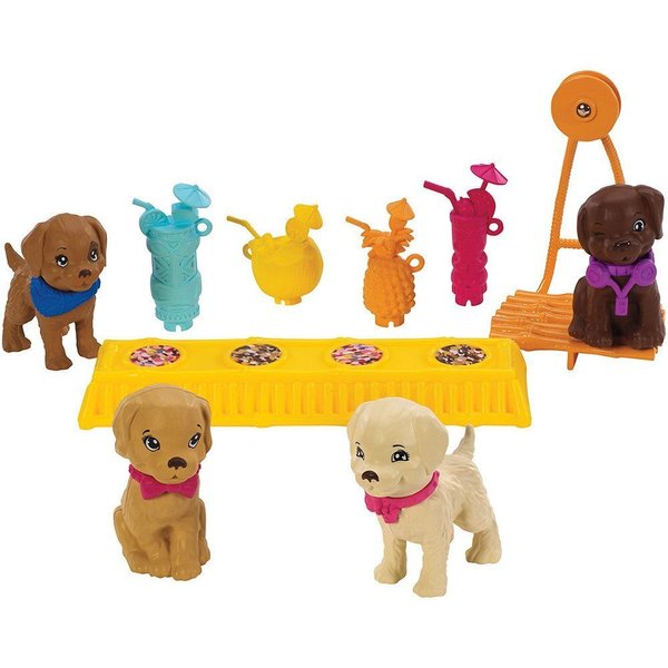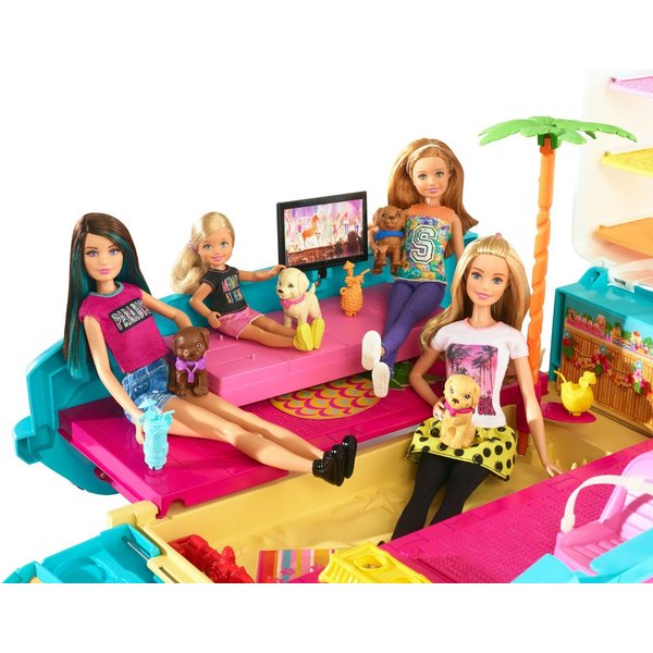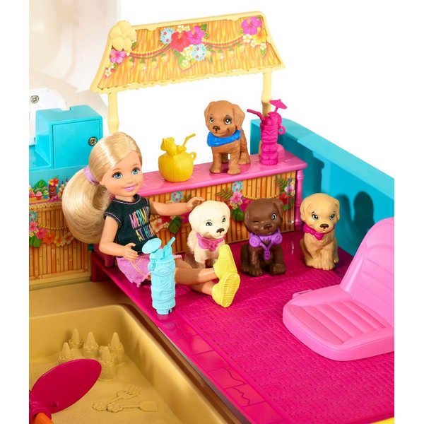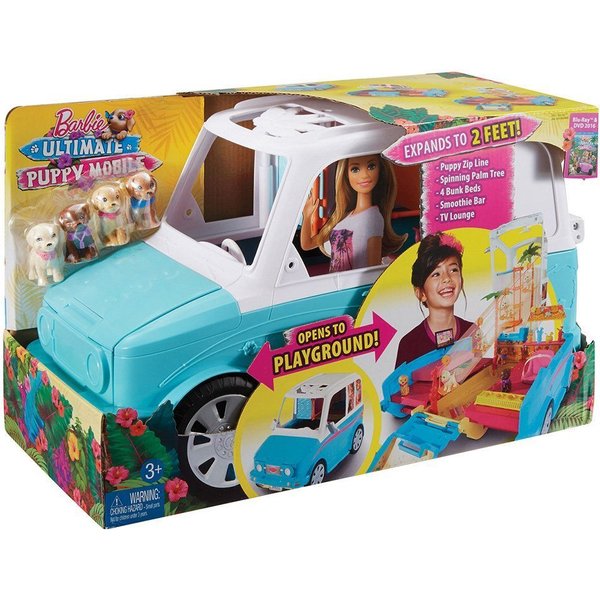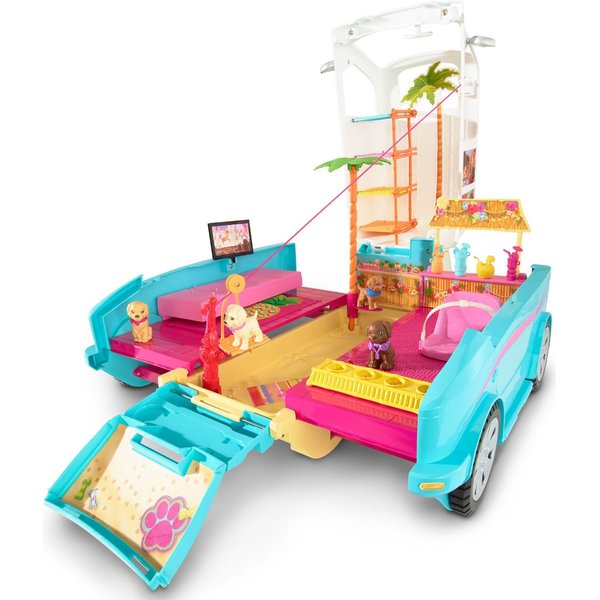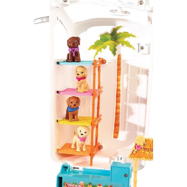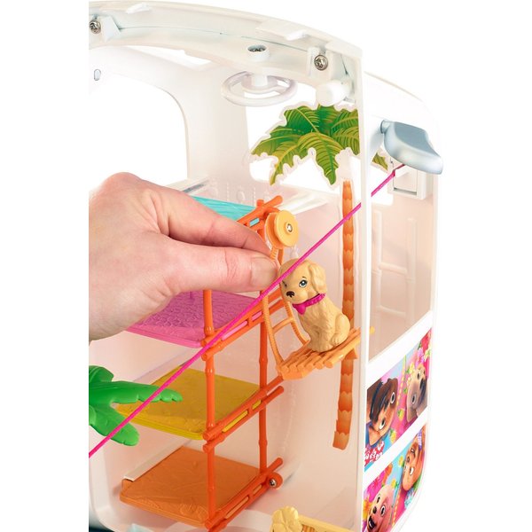 Wybierz się na przejażdżkę kolorowym Suvem z Barbie oraz jej pupilami! Gdy dotrzesz na miejsce przemiń swój pojazd w wesoły plac zabaw. Znajdziesz tu wiele atrakcji zarówno dla Barbie i jej sióstr, jak i małych piesków. Jest tu sala telewizyjna, bar z pysznymi sokami, obrotowa palma do zabawy i wiele więcej! Po całym dniu świetnej zabawy zwierzaczki mogą odpocząć na piętrowym łóżku.