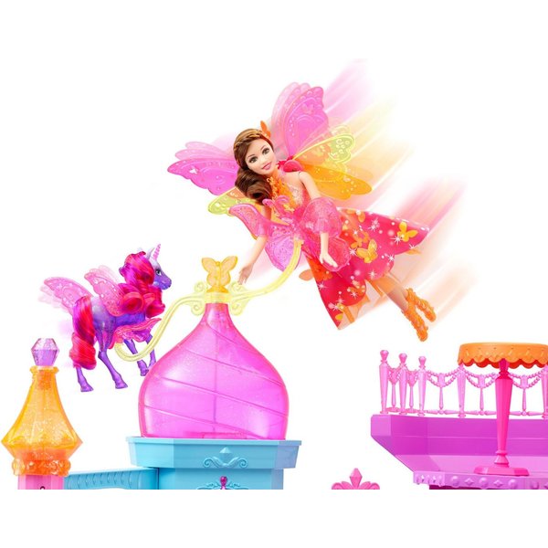 Drzwi w zamku uchylają się, na szczycie znajduje się taras widokowy, z którego Księżniczka może podziwiać widoki. Na wieży jest wiatraczek z motylkami, na których można zaczepić laleczkę oraz baśniowego konika (sprzedawane oddzielnie), pociągnięcie za sznureczek sprawi że zaczną wirować nad wieżą.