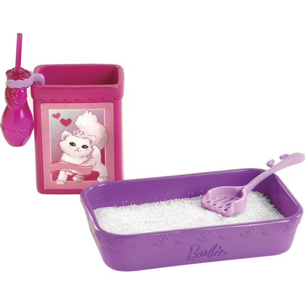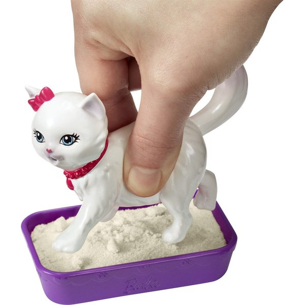 Dzięki zestawowi Barbie z kotkiem można karmić zwierzaka i po nim sprzątać. Ten kotek robi siusiu!