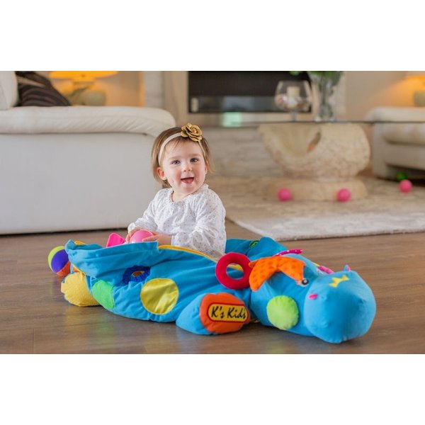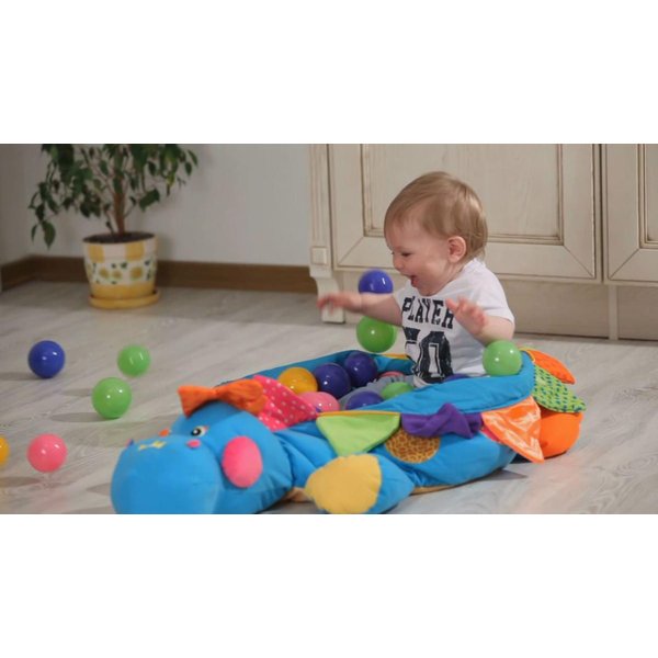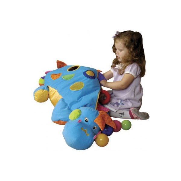 Wesoły, kolorowy dinozaur to zabawka dla dziecka, którą można wykorzystać na wiele sposobów. Wykonany został z miękkiego i przyjemnego w dotyku materiału idealnego do przytulania. W zestawie znajduje się 60 kolorowych piłeczek, za pomocą których maluch może ćwiczyć rzucanie czy chwyt. Po wypełnieniu wnętrza zabawki wszystkimi piłeczkami powstanie mini basen z piłeczkami - świetna zabawa dla dzieci. Po zapięciu grzbietu dinozaura powstaje urocza przytulanka z różnorodnymi strukturami, które pobudzą zmysły dziecka