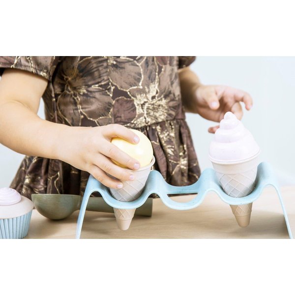 Ekologiczne zabawki wykonane z tzw. bioplastiku pozwolą także na naukę ekologicznej postawy. Wafelki, lody, babeczki, muffiny, łyżka do lodów i stojak na lody umożliwią Twojemu dziecku na zabawę w lodziarnię i cukiernię we własnym domu lub piaskownicy. Niewątpliwą zaletą jest możliwość mycia zabawek w zmywarce, trwałość i przyjazność środowisku - zabawki w 100% nadają się do recyklingu. Pastelowy zestaw wykonany został w 100% z ekologicznej trzciny cukrowej - tzw. bioplastiku, którego produkcja przyczynia się do zredukowania ilości dwutlenku węgla w powietrzu.