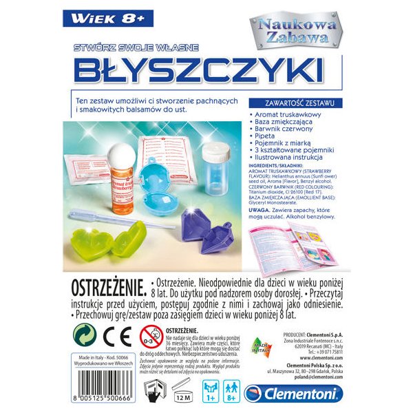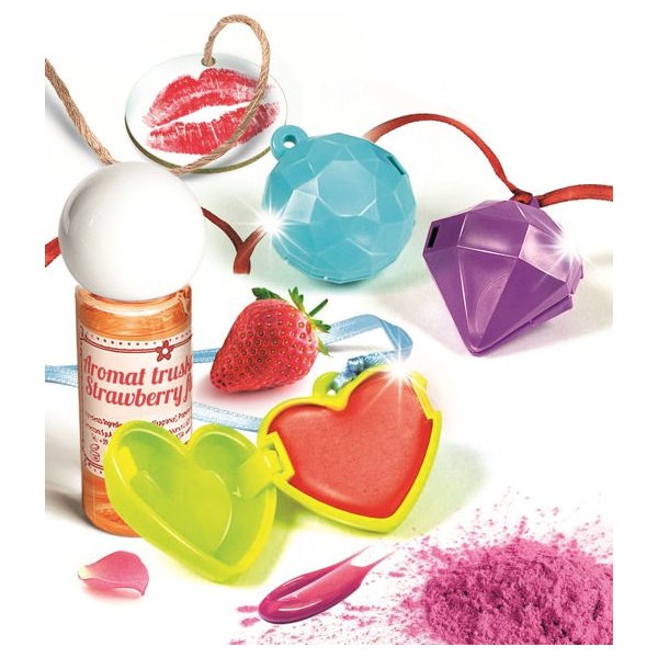 Zestaw do robienia balsamów do ust to marzenie każdej małej dziewczynki. Zaproś swoje przyjaciółki i produkuj cudowne błyszczyki o zapachu truskawkowym. Pojemniczki, w których będą gotowe błyszczyki można mieć zawsze ze sobą - jako wisiorek. Instrukcja dołączona do zestawu pomoże w etapach procesu wytwarzania błyszczyków.